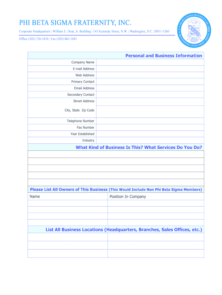 Personal and Business Information Company Name Email Address Web Address Primary Contact Email Address Secondary Contact Street Address City, State Zip Code Telephone Number Fax Number Year Established