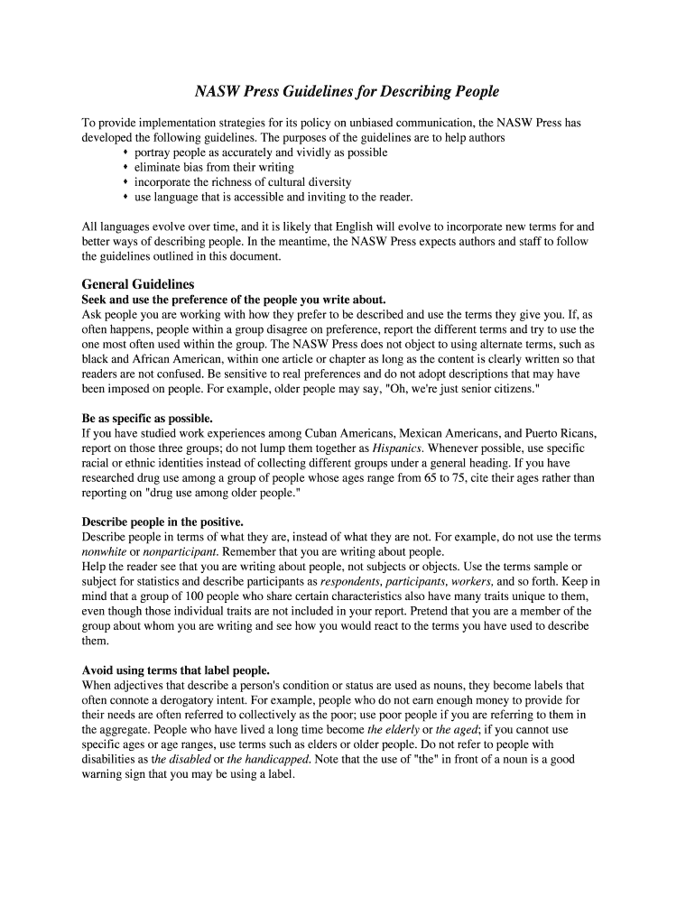NASA Press Guidelines for Describing People To provide implementation strategies for its policy on unbiased communication, the NASA Press has developed the following guidelines. The purposes of the