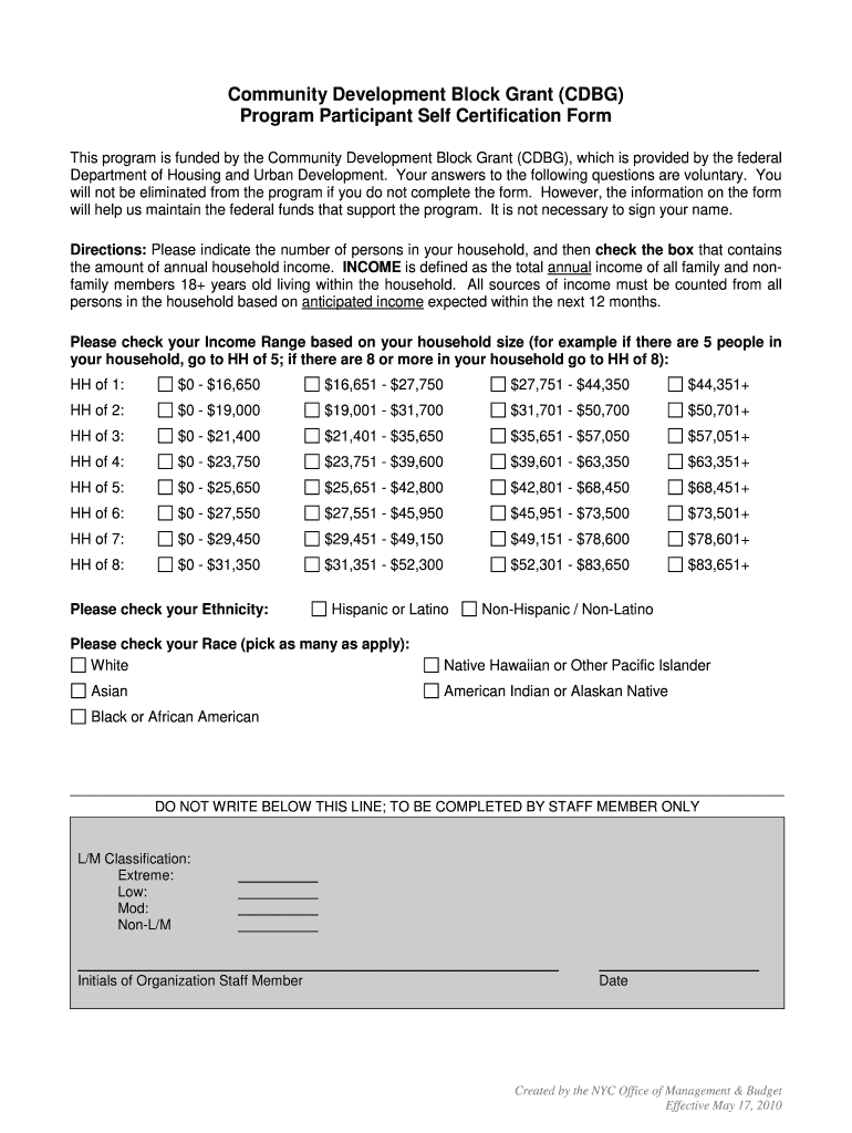 Program participant self certification typically requires participants to report personal or business information, eligibility status, and compliance with program rules.