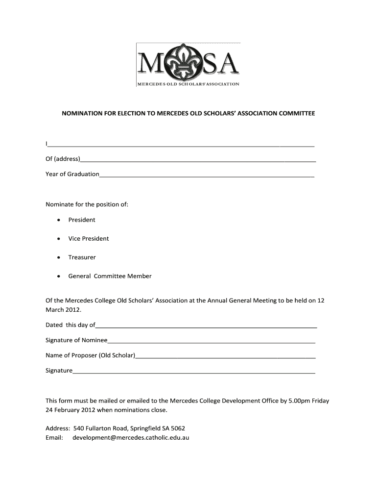 NOMINATION FOR ELECTION TO MERCEDES OLD SCHOLARS ASSOCIATION COMMITTEE I Of (address) Year of Graduation Nominate for the position of: President Vice President Treasurer General Committee Member Of