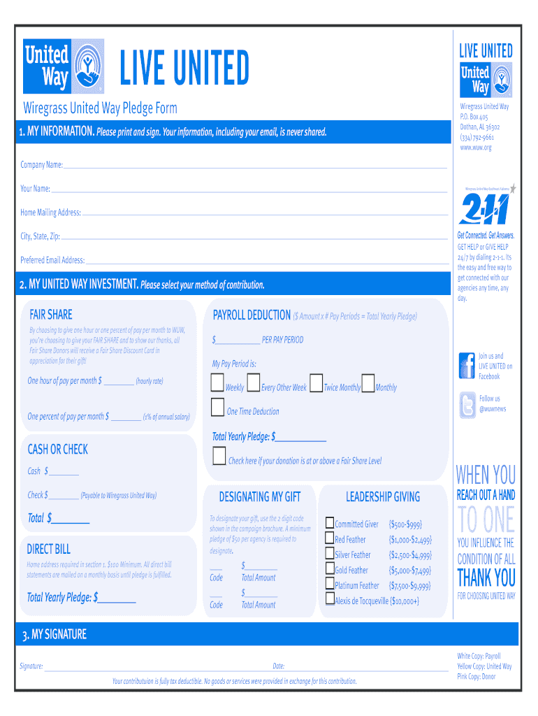 Wire grass United Way Pledge Form Wire grass United Way P.O. Box 405 Dothan, AL 36302 (334) 7929661 www.wuw.org 1. MY INFORMATION. Please print and sign. Your information, including your email, is