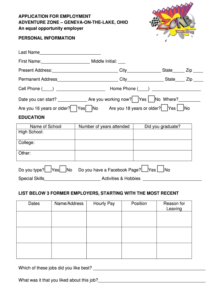 APPLICATION FOR EMPLOYMENT ADVENTURE ZONE GENEVAONTHELAKE, OHIO An equal opportunity employer PERSONAL INFORMATION Last Name First Name: Middle Initial: Present Address: City State Zip Permanent Address