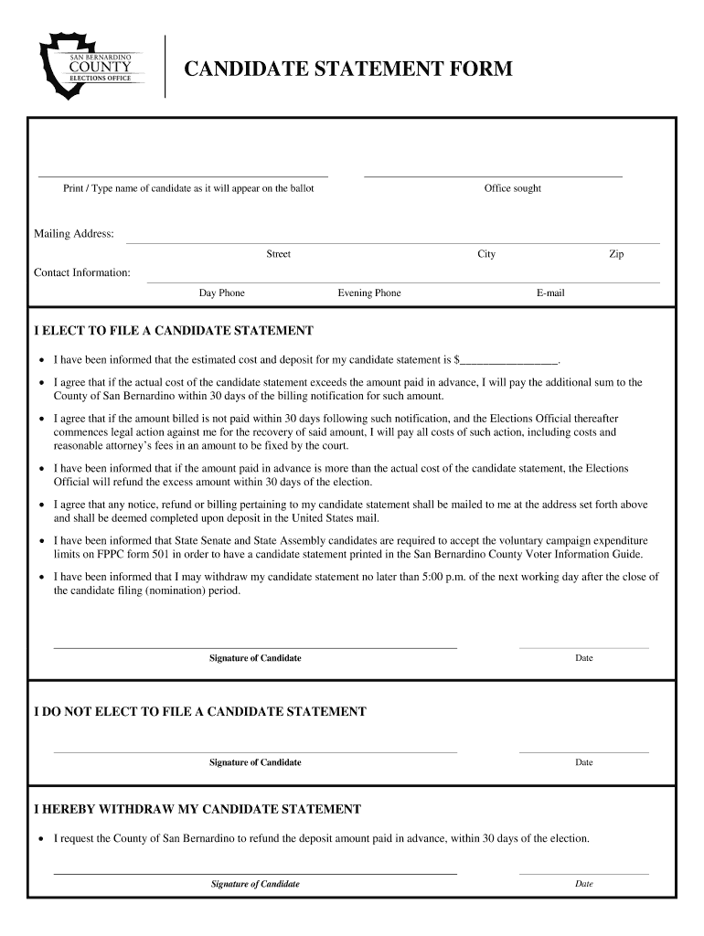 Get the free CANDIDATE STATEMENT FORM - sbcountyelectionscom