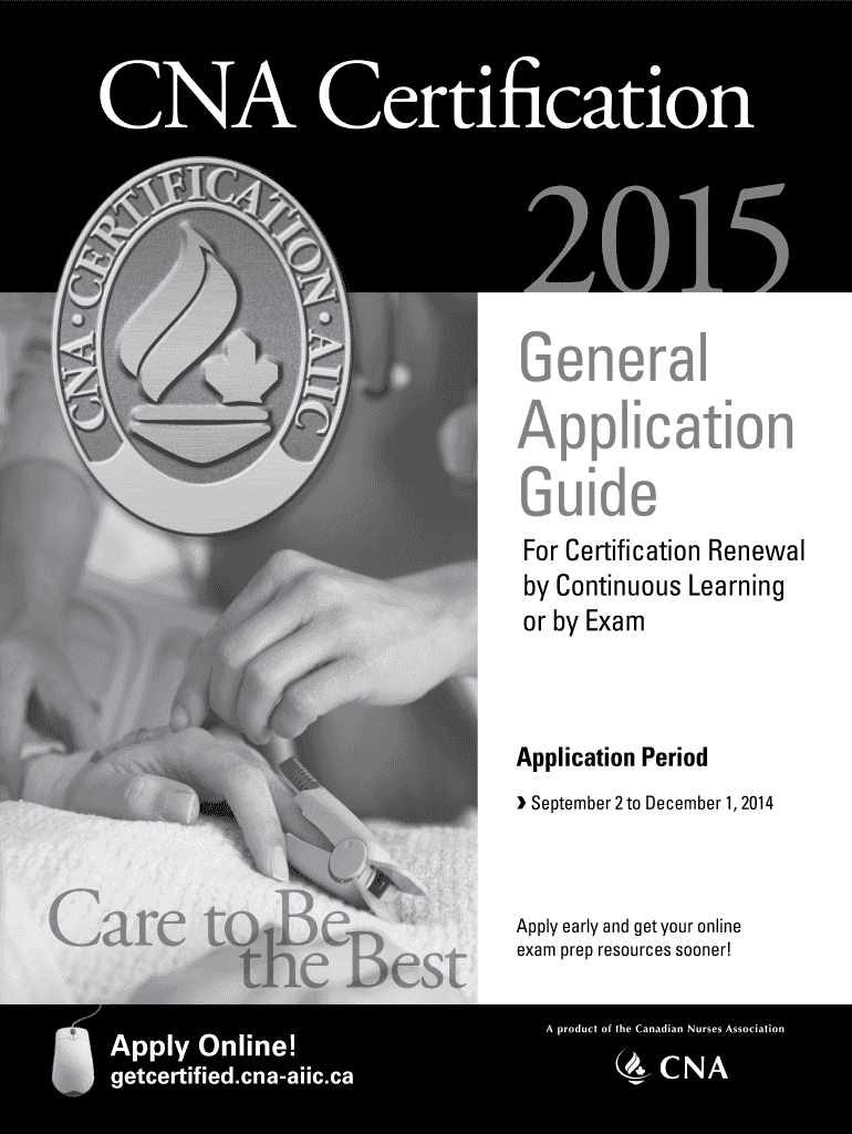 CNA Certification 2015 General Application Guide F or Certification Renewal by Continuous Learning or by Exam Application Period September 2 to December 1, 2014, Care to Behest the Apply Online! Get