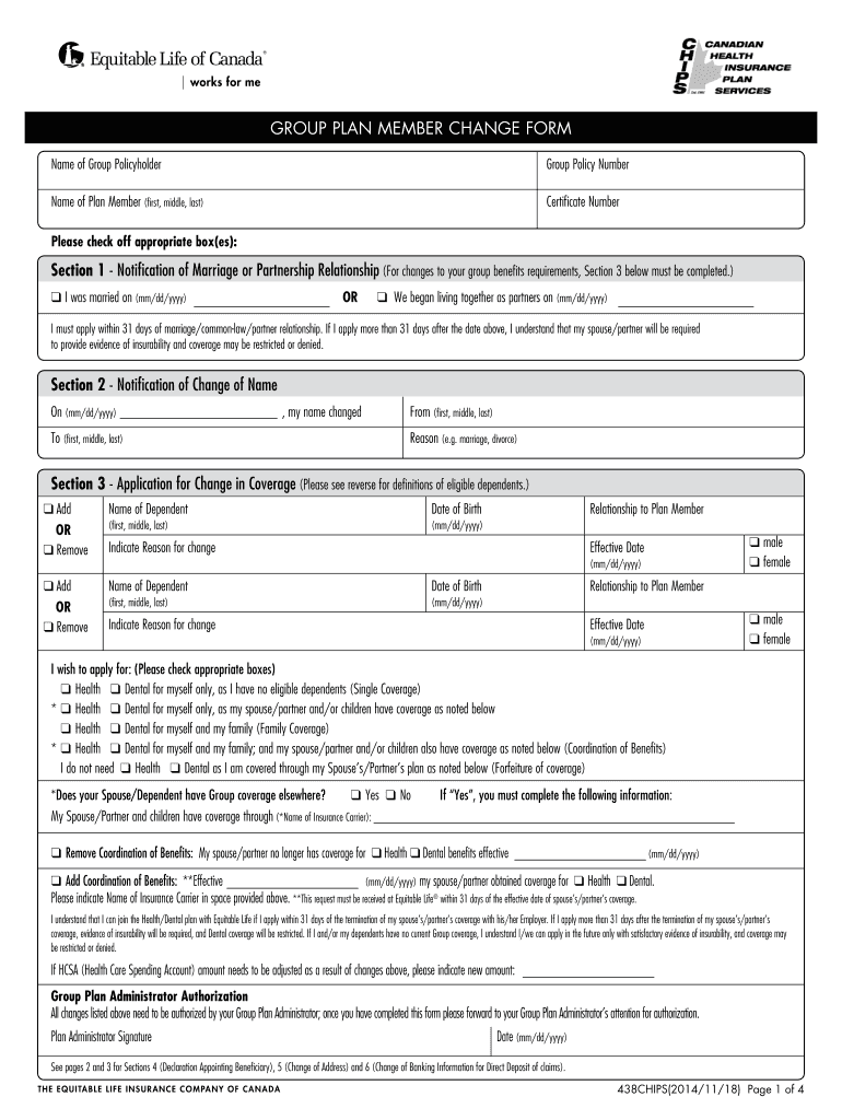 Group plan member change form Name of Group Policyholder Group Policy Number Name of Plan Member (first, middle, last) Certificate Number Please check off appropriate box(BS): Section 1 Notification