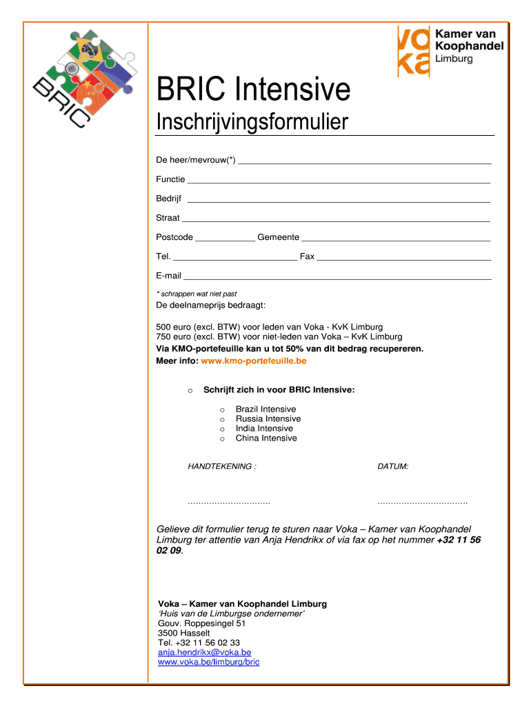 BRIC Intensive Inschrijvingsformulier De her/metro(*) Function Belief Strata Postcode Generate Tel. Fax Email * scrapped was diet past De deelnameprijs redraft: 500 euro (excl. BTW) poor laden van