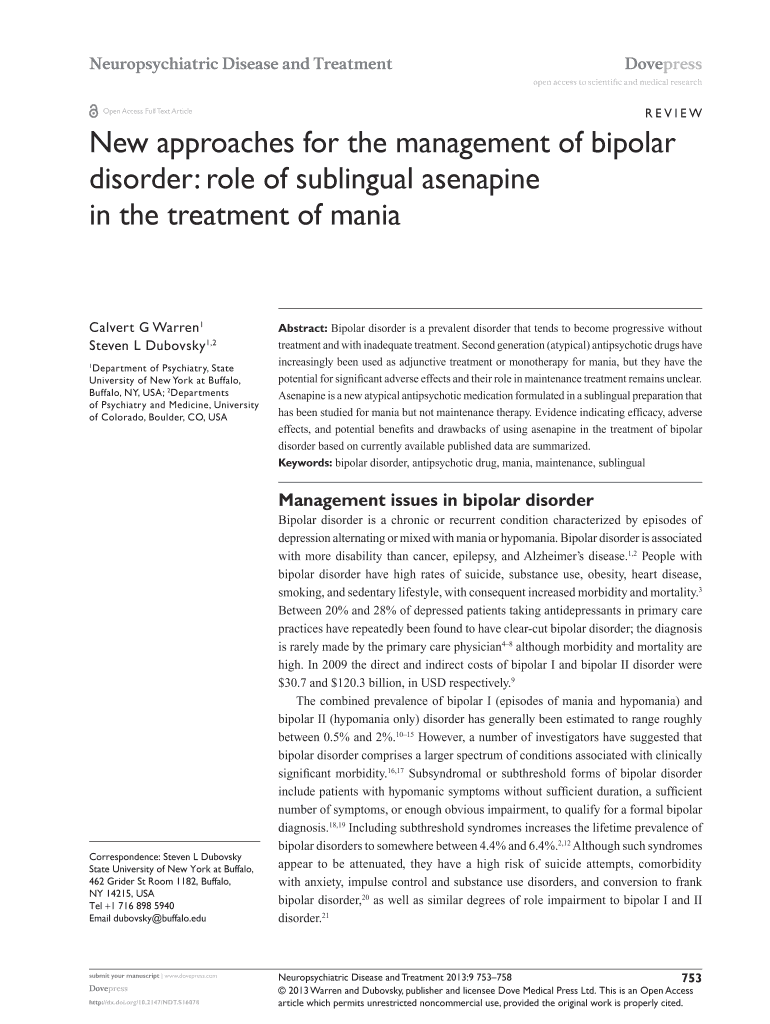Neuropsychiatric Disease and Treatment Dove press open access to scientific and medical research R e v i EW Open Access Full Text Article New approaches for the management of bipolar disorder: role