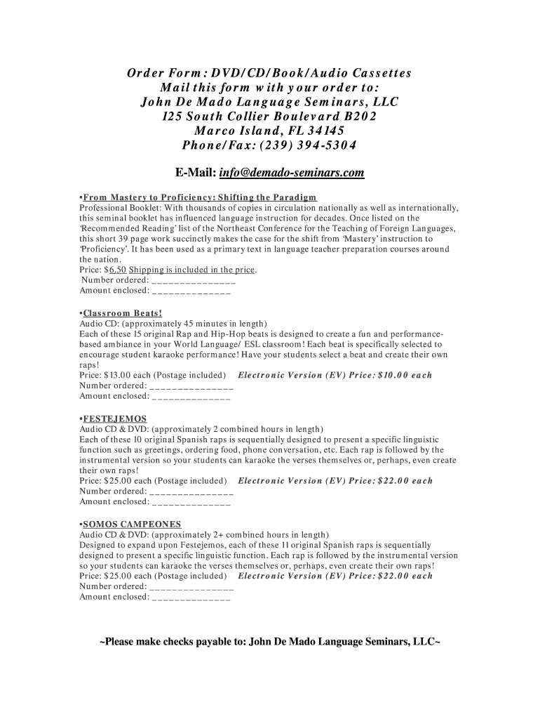 Indicate the quantity and type of each item you wish to order in the designated spaces. For example, if you want to order 2 DVDs, 1 CD, 1 book, and 3 audio cassettes, write "2" in the DVD section, "1" in the CD section, "1" in the book section, and "3" in the audio cassette section.