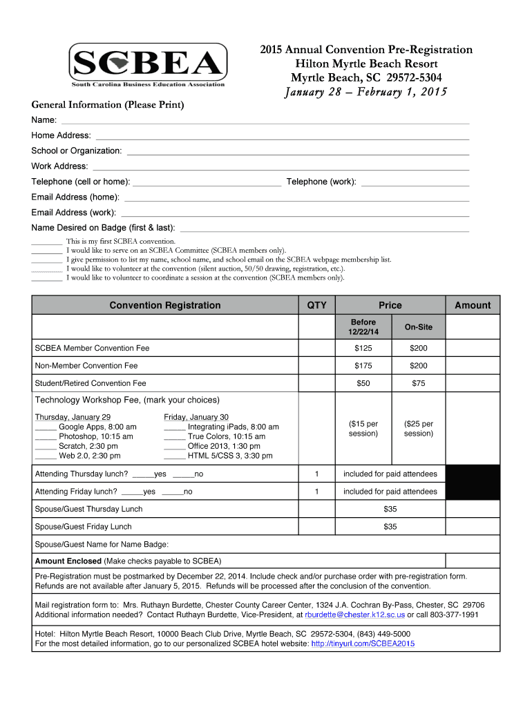 General Information (Please Print) 2015 Annual Convention Preregistration Hilton Myrtle Beach Resort Myrtle Beach, SC 295725304 January 28 February 1, 2015, Name: Home Address: School or Organization: