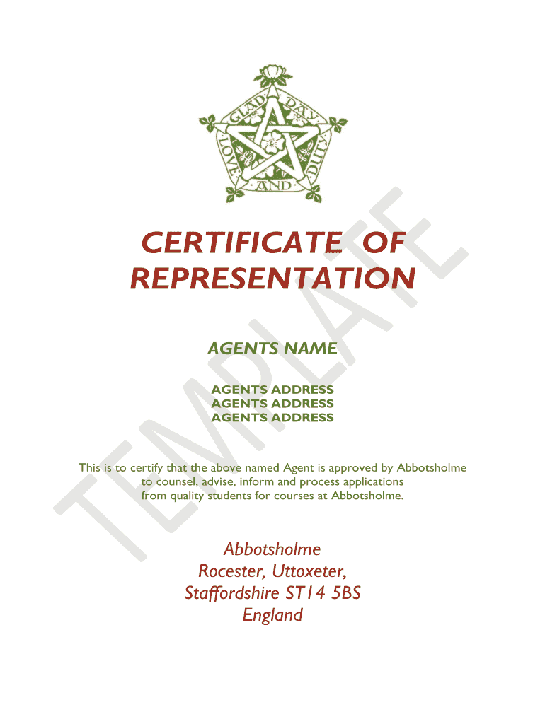 CERTIFICATE OF REPRESENTATION AGENTS NAME AGENTS ADDRESS This is to certify that the above named Agent is approved by Abbotsholme to counsel, advise, inform and process applications from quality students