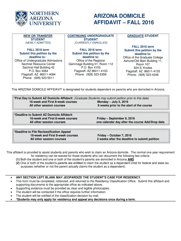 Get the free ARIZONA DOMICILE AFFIDAVIT FALL 2016 - nauedu