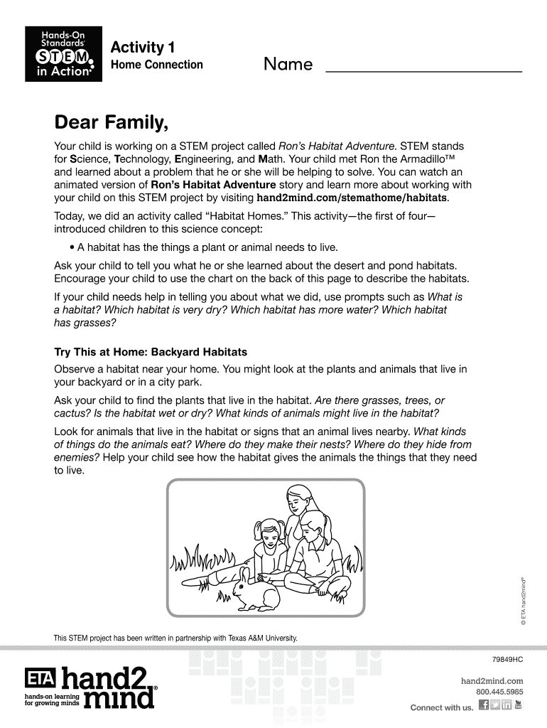 Activity 1 Home Connection Name Dear Family, Your child is working on a STEM project called Ron's Habitat Adventure. STEM stands for Science, Technology, Engineering, and Math. Your child met Ron