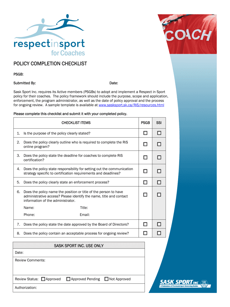 POLICY COMPLETION CHECKLIST PSB: Submitted By: Date: Sask Sport Inc. requires its Active members (Pages) to adopt and implement a Respect in Sport policy for their coaches. The policy framework should