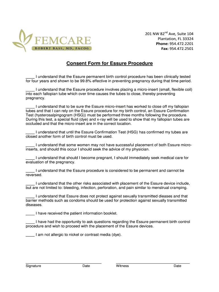 Begin by carefully reading the consent form. Make sure you understand all the information provided, including the risks, benefits, and alternatives to the Essure procedure.