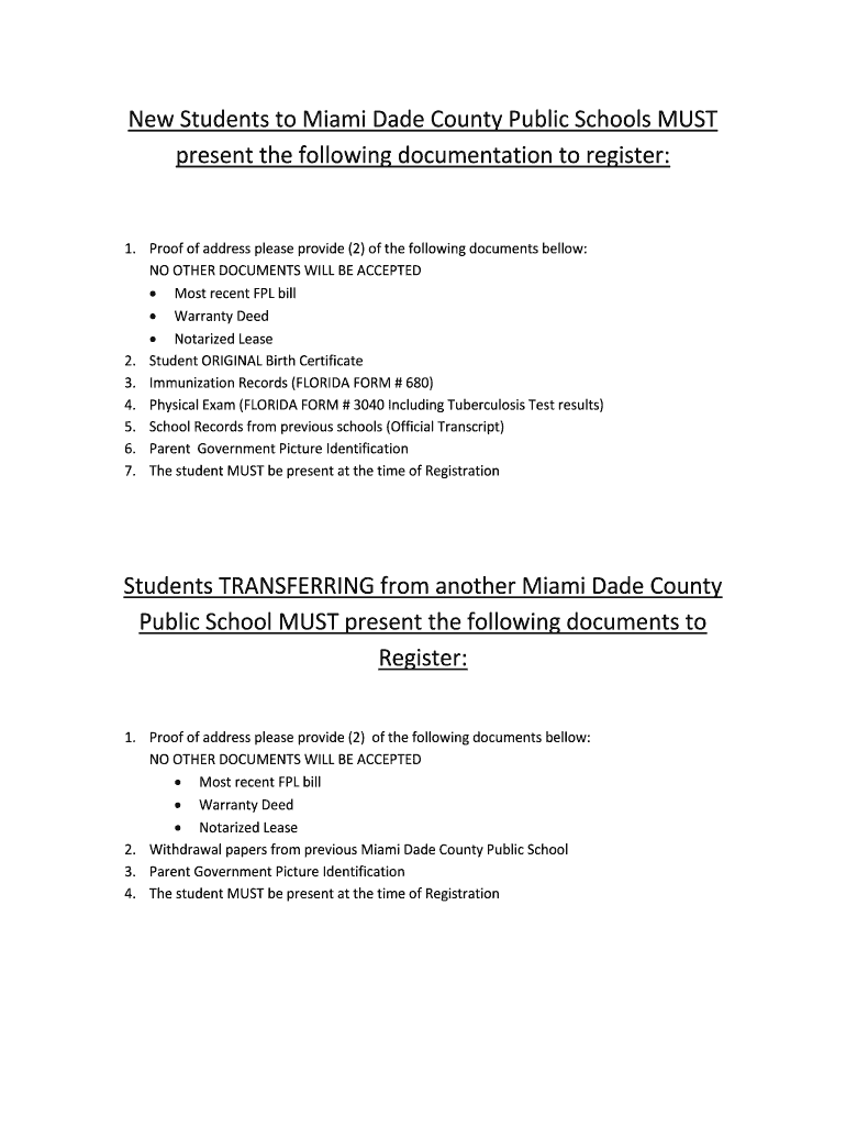 New Students to Miami-Dade County Public Schools MUST present the following documentation to register:1. Proof of address please provide (2) of the following documents bellow: NO OTHER DOCUMENTS WILL