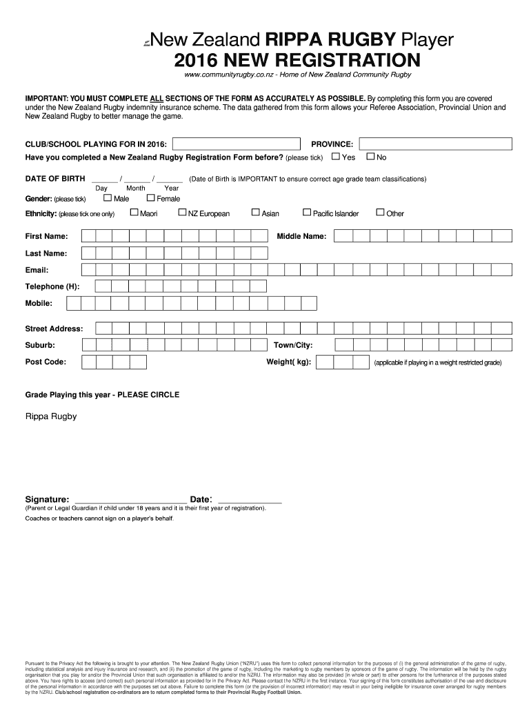 New Zealand RI PPA RUGBY Player 2016 NEW REGISTRATION www.communityrugby.co.nz Home of New Zealand Community Rugby IMPORTANT: YOU MUST COMPLETE ALL SECTIONS OF THE FORM AS ACCURATELY AS POSSIBLE.