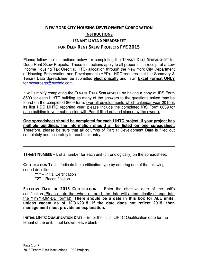 NEW YORK CITY HOUSING DEVELOPMENT CORPORATION INSTRUCTIONS TENANT DATA SPREADSHEET FOR DEEP RENT SKEW PROJECTS FYE 2015 Please follow the instructions below for completing the TENANT DATA SPREADSHEET