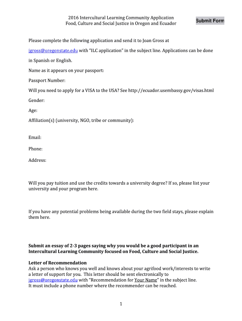 2016 Intercultural Learning Community Application Food, Culture and Social Justice in Oregon and Ecuador Submit Form Please complete the following application and send it to Joan Gross at gross reinstate.edu