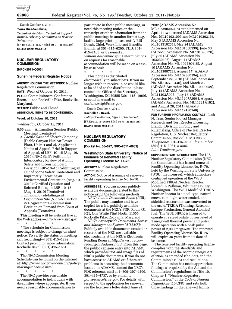 62868 Federal Register / Vol. 76, No. 196 / Tuesday, October 11, 2011 / Notices Dated: October 4, 2011. Moira DiazSanabria, Technical Assistant, Technical Support Branch, Advisory Committee on Reactor