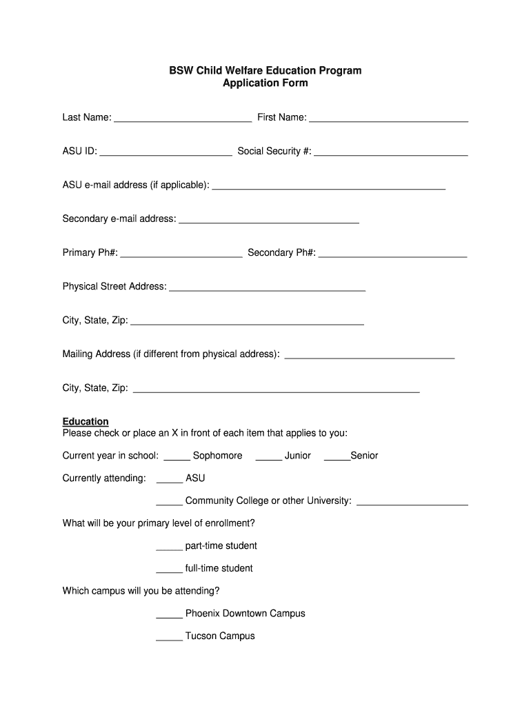 BSW Child Welfare Education Program Application Form Last Name: First Name: ASU ID: Social Security #: ASU email address (if applicable): Secondary email address: Primary pH#: Secondary pH#: Physical