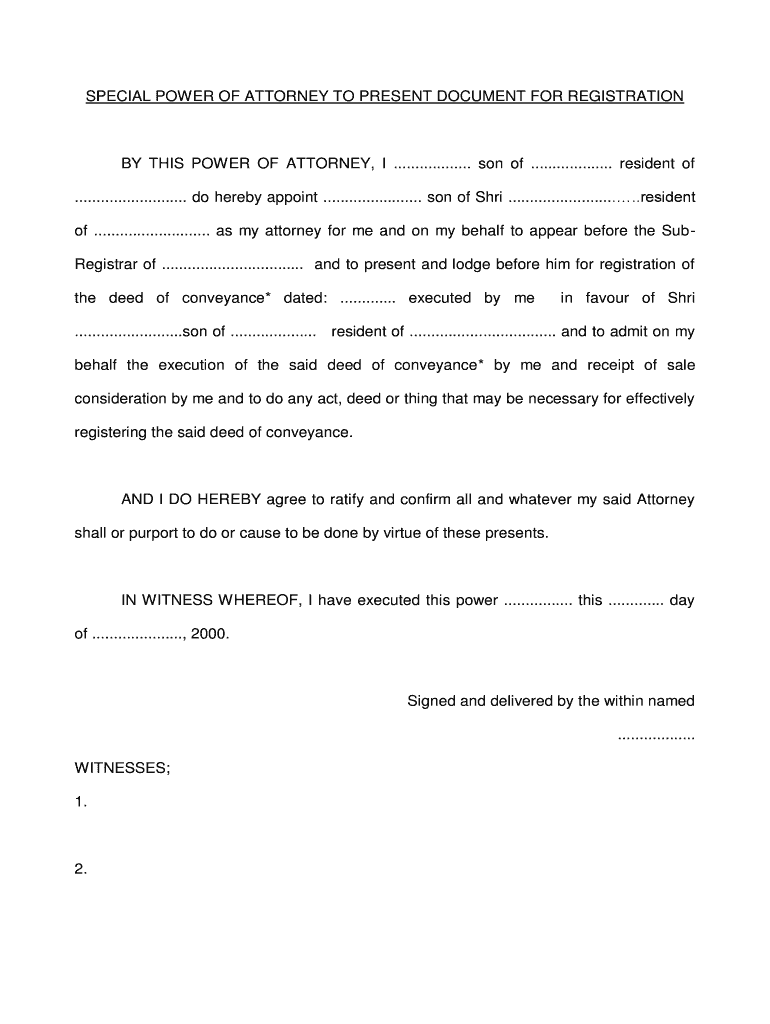 SPECIAL POWER OF ATTORNEY TO PRESENT DOCUMENT FOR REGISTRATION THIS POWER OF ATTORNEY, I .................. son of ................... resident of