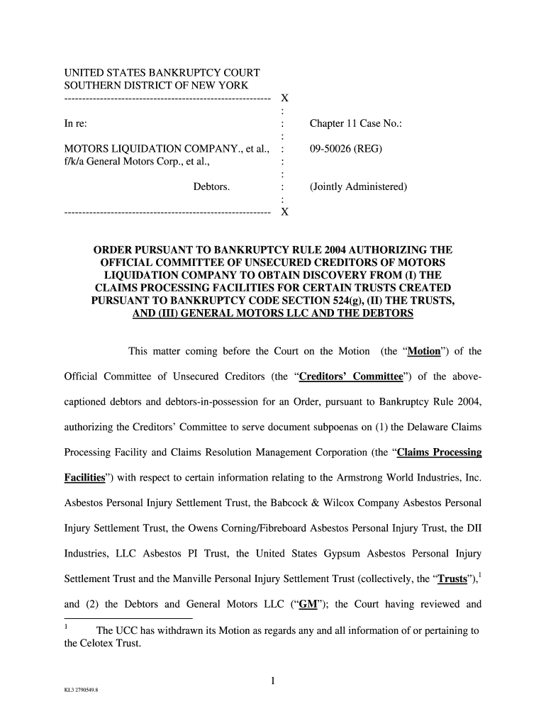 This document is an order from the United States Bankruptcy Court for the Southern District of New York that authorizes the Official Committee of Unsecured Creditors of Motors Liquidation Company