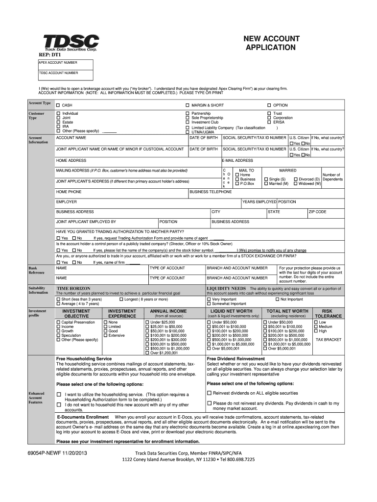 Print Form NEW ACCOUNT APPLICATION REP: DT1 AA APEX ACCOUNT NUMBER DSC ACCOUNT NUMBER I (We) would like to open a brokerage account with you (my broker). I understand that you have designated Apex