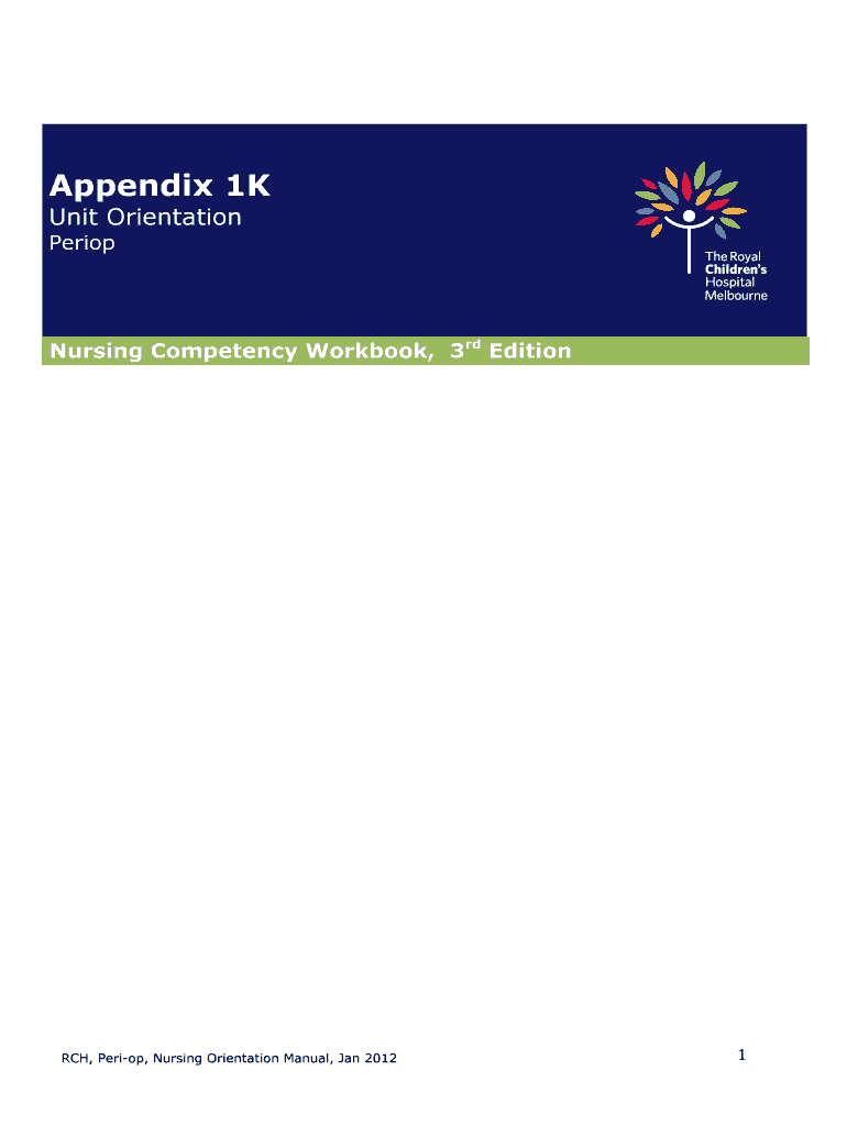 Appendix 1K Unit Orientation Period Nursing Competency Workbook, 3rd Edition RCH, Period, Nursing Orientation Manual, Jan 2012 1 The Royal Children's Hospital (RCH) Nursing Competency Workbook is
