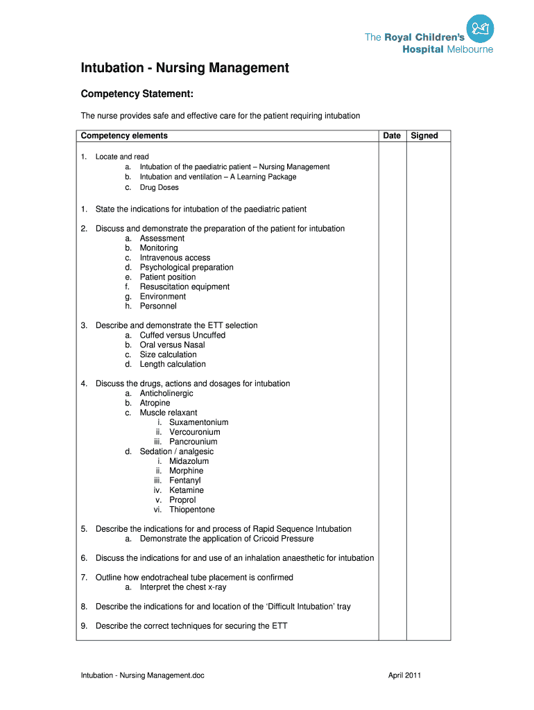 Intubation Nursing Management Competency Statement: The nurse provides safe and effective care for the patient requiring intubation Competency elements 1. DateSignedLocate and read a. Intubation of