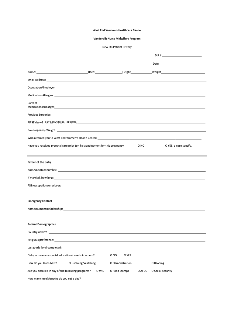 West End Women's Healthcare Center Vanderbilt Nurse Midwifery Program New OB Patient History MR # Date Name: Race: Height Weight Email Address: Occupation/Employer: Medication Allergies: Current Medications/Dosages