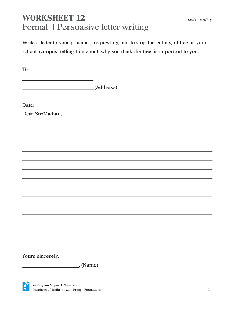 WORKSHEET 12 Formal Persuasive letter writingLetter writingWrite a letter to your principal, requesting him to stop the cutting of tree in your school campus, telling him about why you think the tree