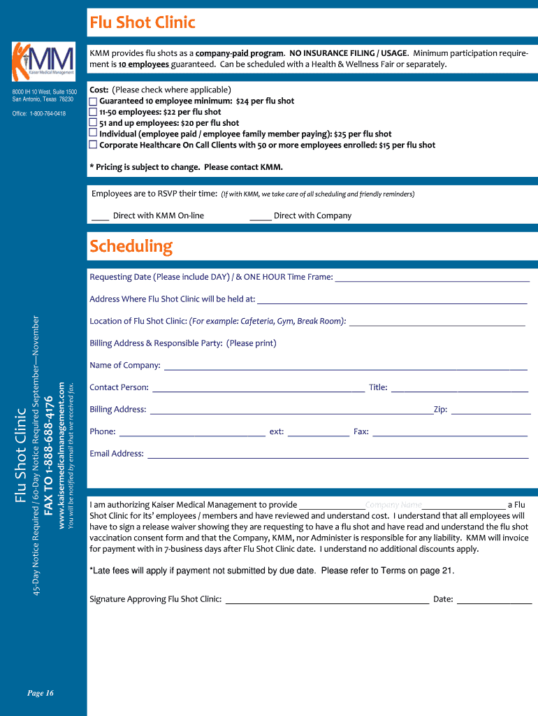 FluShotClinic KMMprovidesflushotsasacompanypaidprogram.NOINSURANCEFILING/USAGE. Minimumparticipationrequire mentis10employeesguaranteed. CanbescheduledwithaHealth&WellnessFairorseparately. 8000 IH
