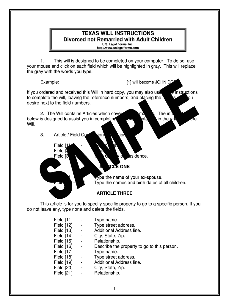 TEXAS WILL INSTRUCTIONS Divorced not Remarried with Adult Children U.S. Legal Forms, Inc. http://www.uslegalforms.com 1. This will is designed to be completed on your computer. To do so, use your