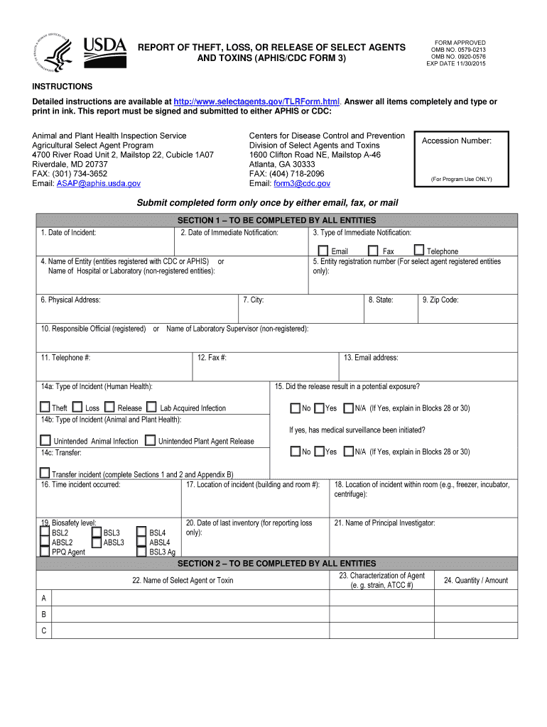 FORM APPROVED OMB NO. 05790213 OMB NO. 09200576 EXP DATE 11/30/2015 REPORT OF THEFT, LOSS, OR RELEASE OF SELECT AGENTS AND TOXINS (APHID/CDC FORM 3) INSTRUCTIONS Detailed instructions are available