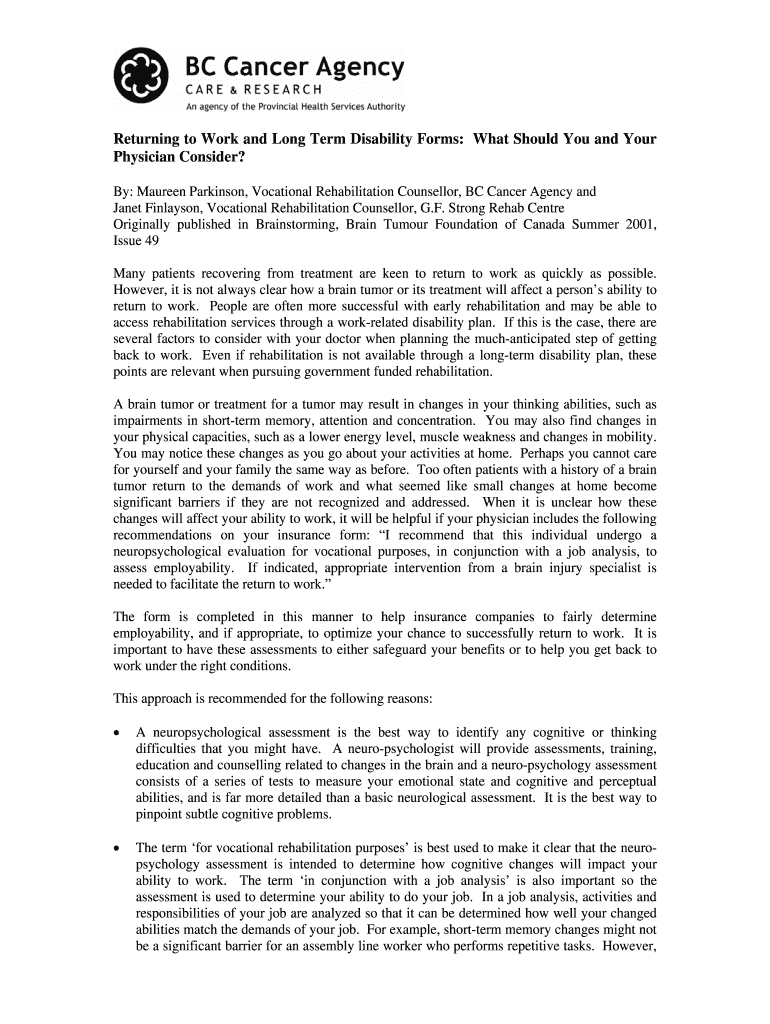 Get the free Returning to Work and Long Term Disability Forms - bccancer bc