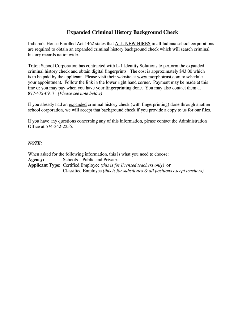 Various educational institutions or programs may request an expanded criminal history background check for admission or enrollment purposes.