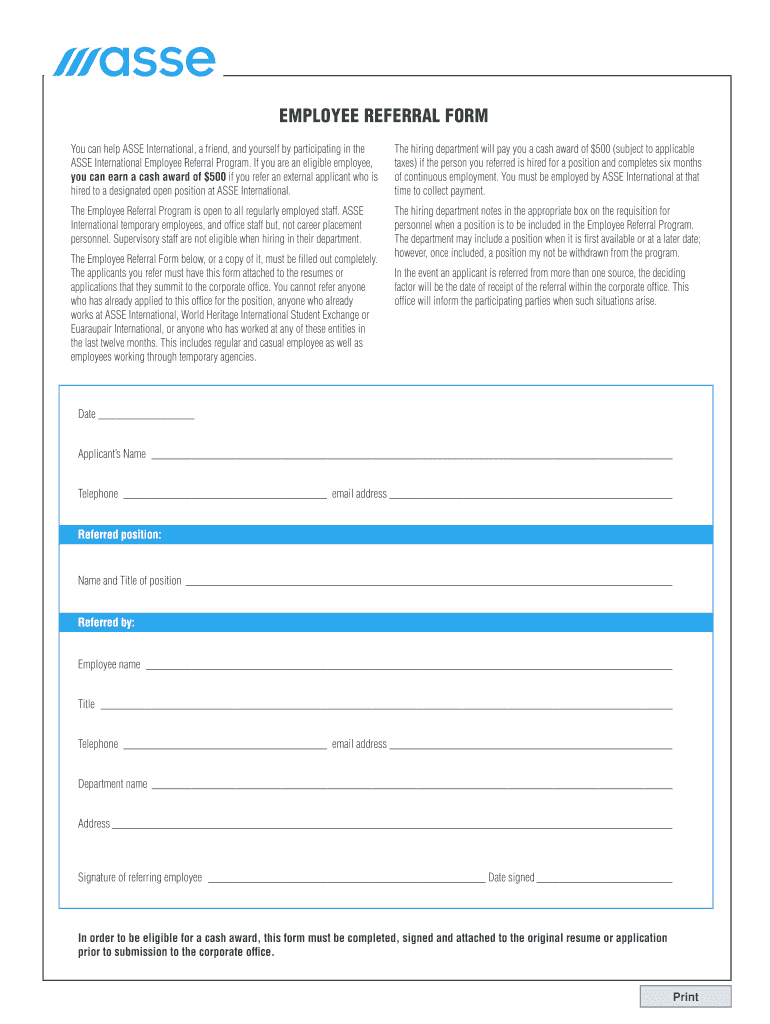 EMPLOYEE REFERRAL FORM You can help ASSE International, a friend, and yourself by participating in the ASSE International Employee Referral Program. If you are an eligible employee, you can earn a