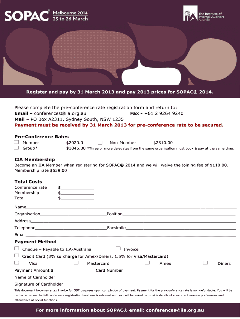 Register and pay by 31 March 2013 and pay 2013 prices for OPAC 2014. Please complete the conference rate registration form and return to: Email conferences IIA.org.AU Fax +61 2 9264 9240 Mail PO Box