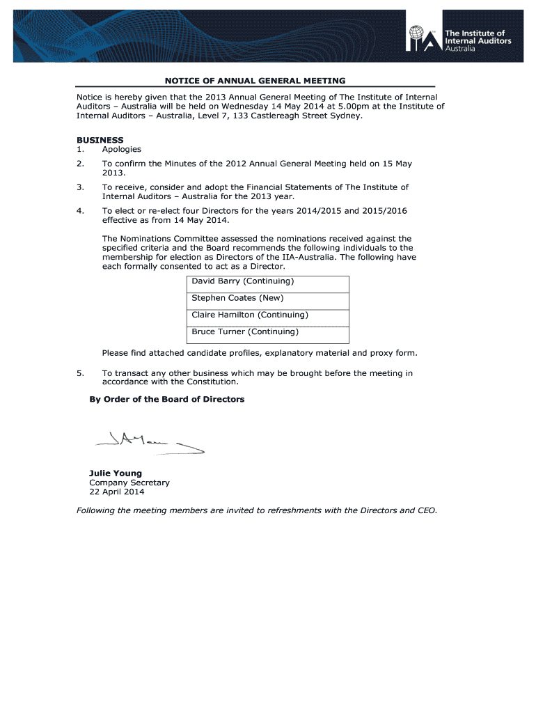 NOTICE OF ANNUAL GENERAL MEETING Notice is hereby given that the 2013 Annual General Meeting of The Institute of Internal Auditors Australia will be held on Wednesday 14 May 2014 at 5.00pm at the