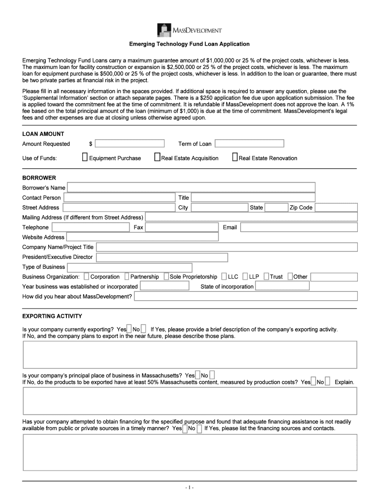 This document serves as an application for loans through the Emerging Technology Fund, providing guidelines on the loan amounts, application fees, required information from the borrowers, and terms