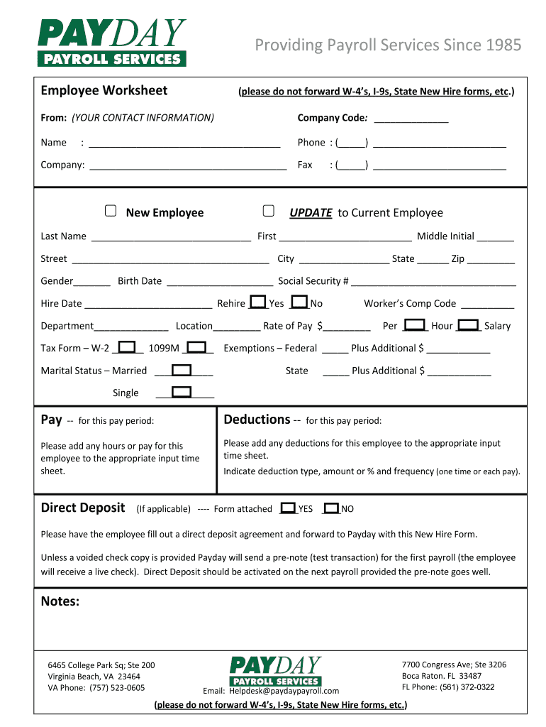 Providing Payroll Services Since 1985 Employee Worksheet (please do not forward W4s, I's, State New Hire forms, etc.) From: (YOUR CONTACT INFORMATION) Company Code: Name Phone : () : Company: New