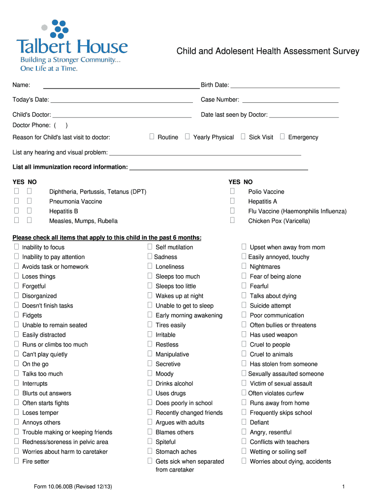 Get the free Child and Adolesent Health Assessment Survey - Talbert House