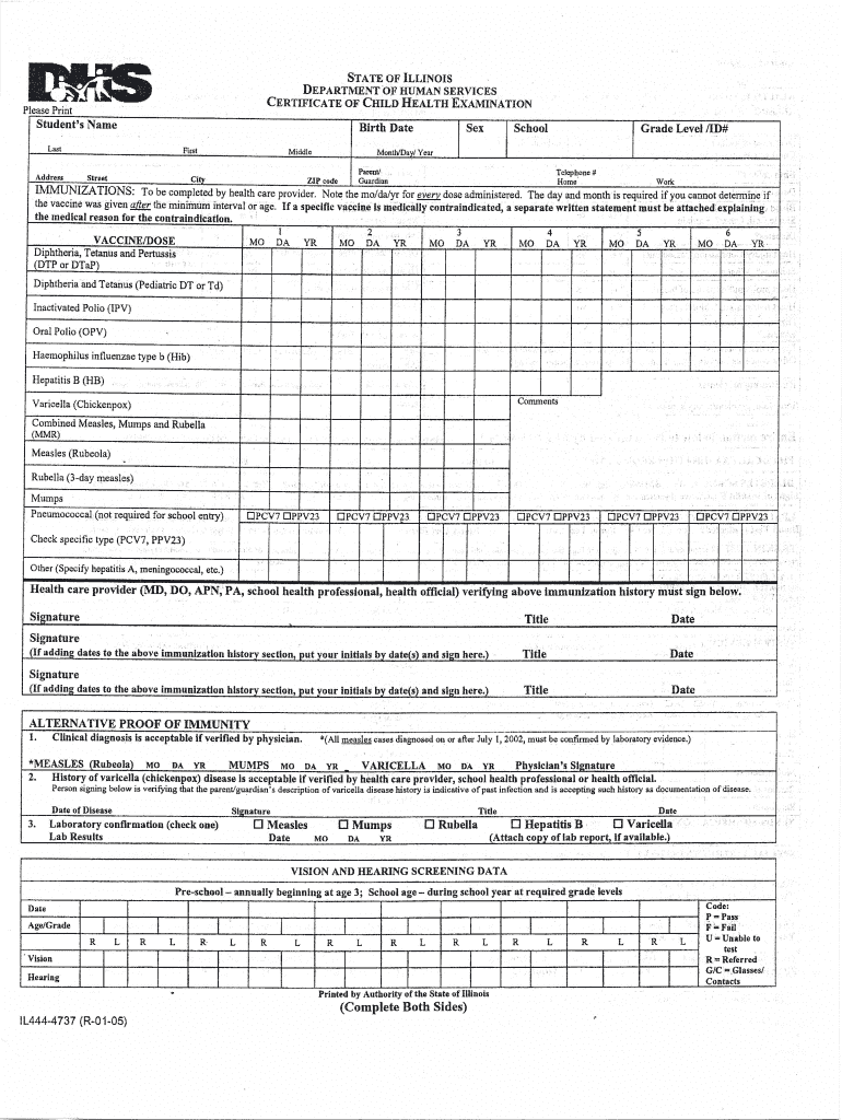 Please Print Student's STATE OF ILLINOIS DEPARTMENT OF HUMAN SERVICES CERTIFICATE OF CHILD HEALTH EXAMINATION Name Birth Last First Middle I Date Month/Dave School Sex Grade Levelled# Y car c Address
