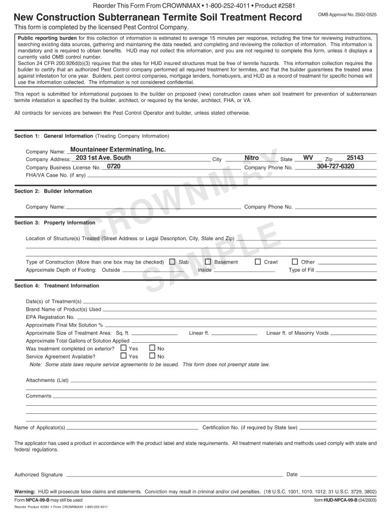 Reorder This Form From CROWN 18002524011 Product #2581 OMB Approval No. 25020525 New Construction Subterranean Termite Soil Treatment Record This form is completed by the licensed Pest Control Company.