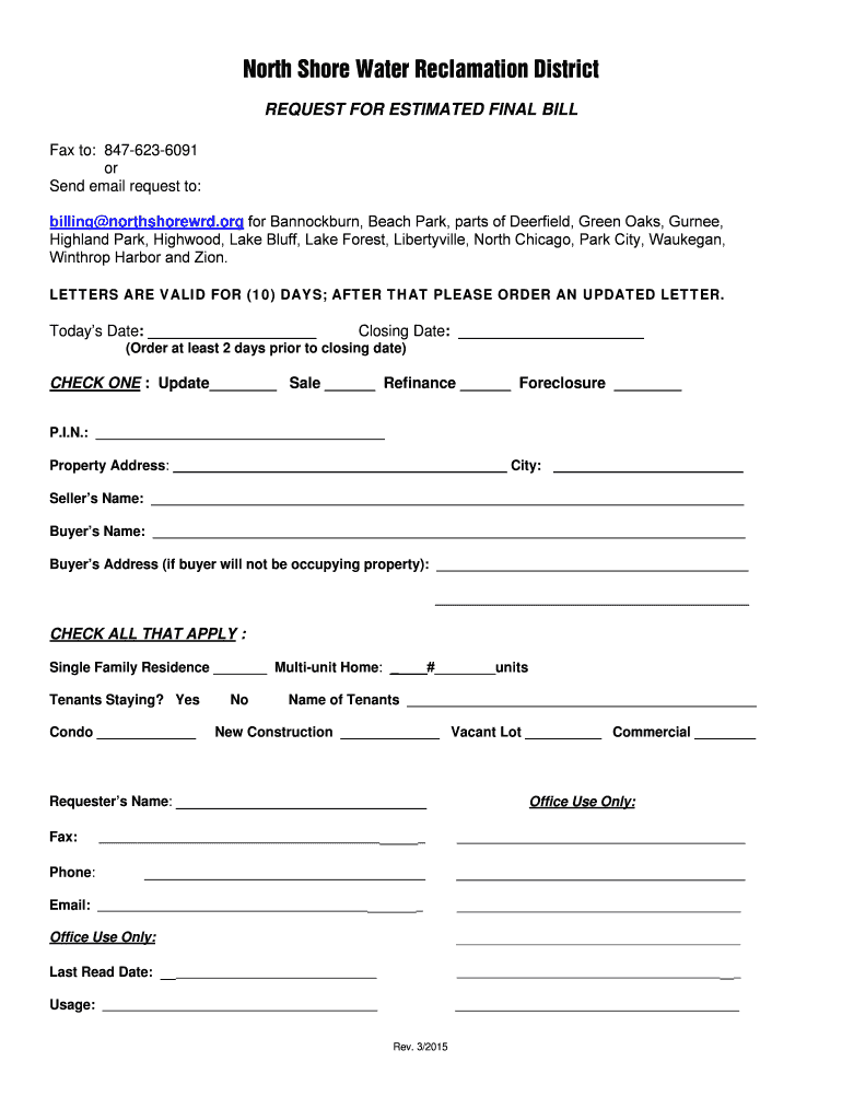 North Shore Water Reclamation District REQUEST FOR ESTIMATED FINAL BILL Fax to: 8476236091 or Send email request to: billing northshorewrd.org for Bannockburn, Beach Park, parts of Deerfield, Green