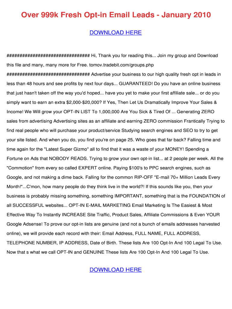 Get the free Over 999k Fresh Opt-in Email Leads - January 2010 - Dlfiles24.com