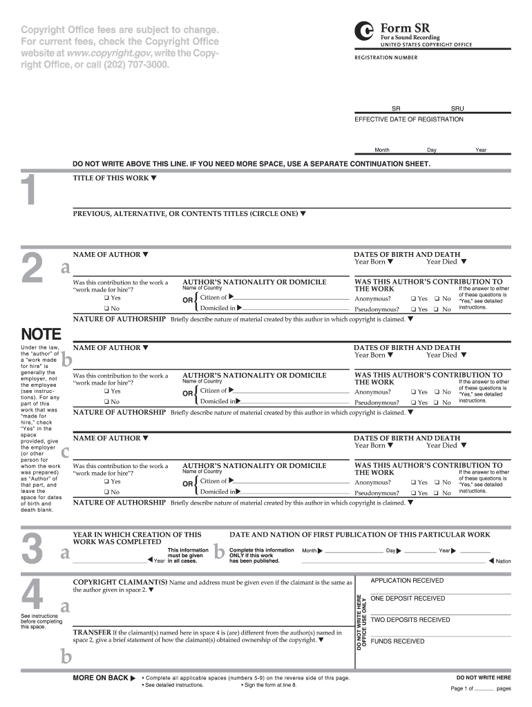 3 Form SR Copyright Office fees are subject to change. For current fees, check the Copyright Office website at www.copyright.gov, write the Copyright Office, or call (202) 7073000. For a Sound Recording