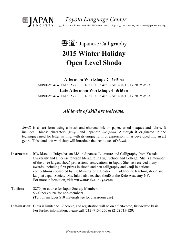 Toyota Language Center : Japanese Calligraphy 2015 Winter Holiday Open Level Shod Afternoon Workshop: 2 3:45 PM MONDAYS & WEDNESDAYS DEC. 14, 16 & 21, JAN. 4, 6, 11, 13, 20, 25 & 27 Late Afternoon