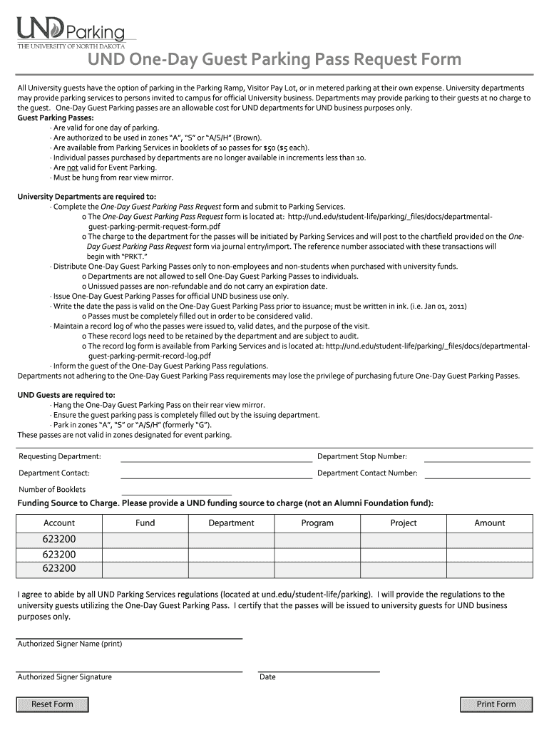 UND One Day Guest Parking Pass Request Form All University guests have the option of parking in the Parking Ramp, Visitor Pay Lot, or in metered parking at their own expense. University departments
