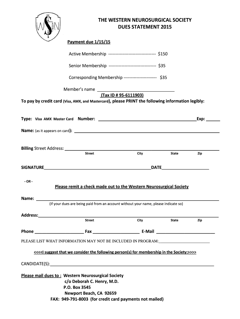 THE WESTERN NEUROSURGICAL SOCIETY DUES STATEMENT 2015 Payment due 1/15/15 Active Membership $150 Senior Membership $35 Corresponding Membership $35 Members name (Tax ID # 956111903) To pay by credit